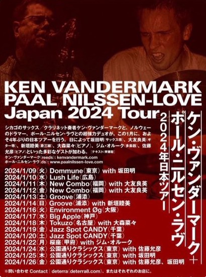 デュオの直近のツアーは、2019年にブラジルと日本で行われた。 二人は2024年1月に再び来日し、 ポール・ニルセン・ラヴ&ケン・ヴァンダーマルクのリリースに合わせた一連のコンサートを行う: JAPAN 2019』ボックスセットの発売に合わせて、一連のコンサートを開催する: このボックスセットには、坂田明、佐藤允彦、高橋悠治といった伝説的な日本人ミュージシャンとのコラボレーションが収録されている。
