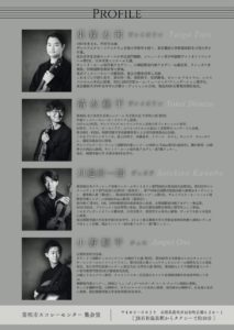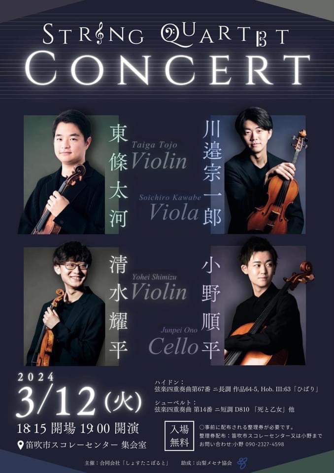 山梨県出身のヴァイオリンの東條太河、チェロの小野順平に加え、桐朋学園大学で学ぶヴァイオリンの清水耀平、ヴィオラの河邉宗一郎の4人で弦楽四重奏のコンサートを行います。