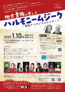 ■18世紀後半から19世紀前半、モーツァルトやベートーヴェンが活躍していた時代、ヨーロッパの地方貴族は都市の流行をどう楽しんでいたのでしょうか?地方ではハルモニームジーク(管楽八重奏)を通じて都市で流行した音楽に触れていました。そんな風景に山梨を重ねて、モーツァルトの残したハルモニームジークによるセレナーデと、そんなモーツァルトに憧れを抱いていたグノーの小交響曲を織り混ぜたプログラムのコンサート。演奏は県内在住者を中心に組まれたプロ奏者集団「アンサンブルカンパニーオブヤマナシ」。新年の始まりを華やかな音楽で彩ってみるのはいかがでしょうか。