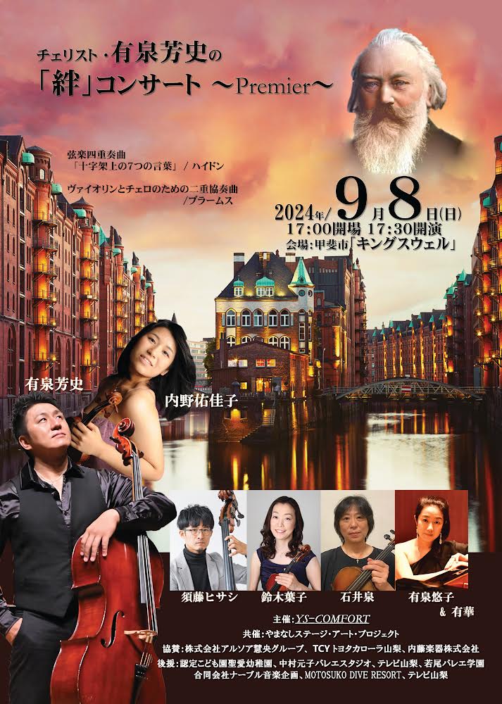 チェリスト・有泉芳史の「絆」コンサート~Premier~ 2024年9月8日(日) 17:00開場17:30開演 会場:甲斐市「キングスウェル」 <料金> 一般5,000円 学生3,000円 <チケットお申し込み> YC...