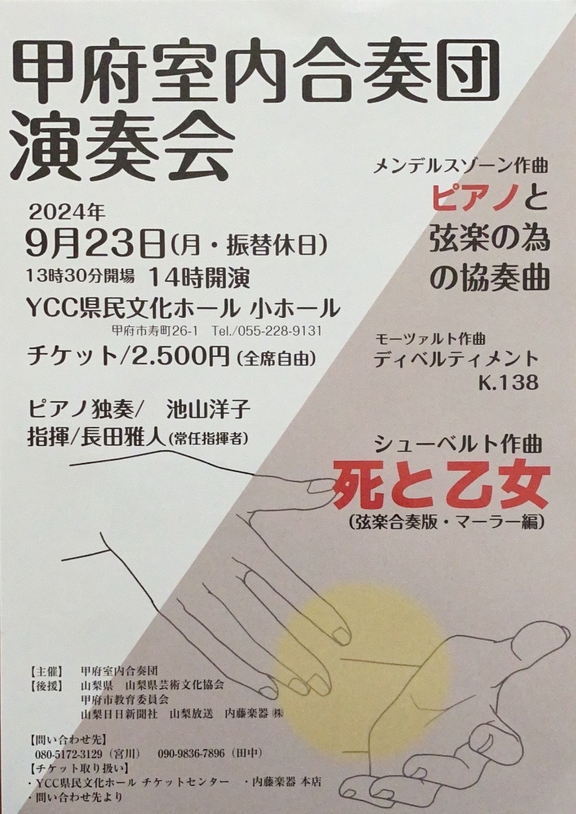 開場時間 : 13時30分 開演時間 : 14時 開催場所 : YCC県民文化ホール 小ホール 入場料 : 2500円 指揮 長田雅人 ピアノ 池山洋子 演奏 甲府室内合奏団 モーツァルト ディベルティメントK.138 ...
