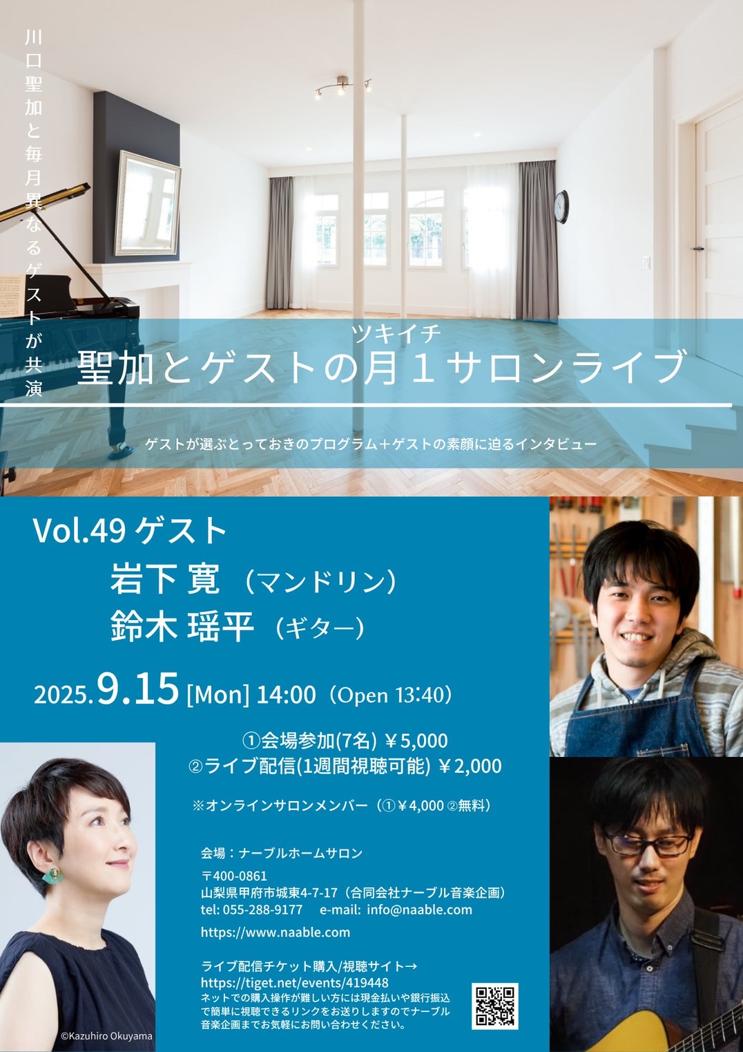 出演: 岩下寛(マンドリン) 鈴木瑶平(ギター) 川口 聖加(ソプラノ) 2025年9月15日(月) 14時開演(13時40分開場) 会場: ナーブルホームサロン 〒400-0861 山梨県甲府市城東4-7-17(合同...
