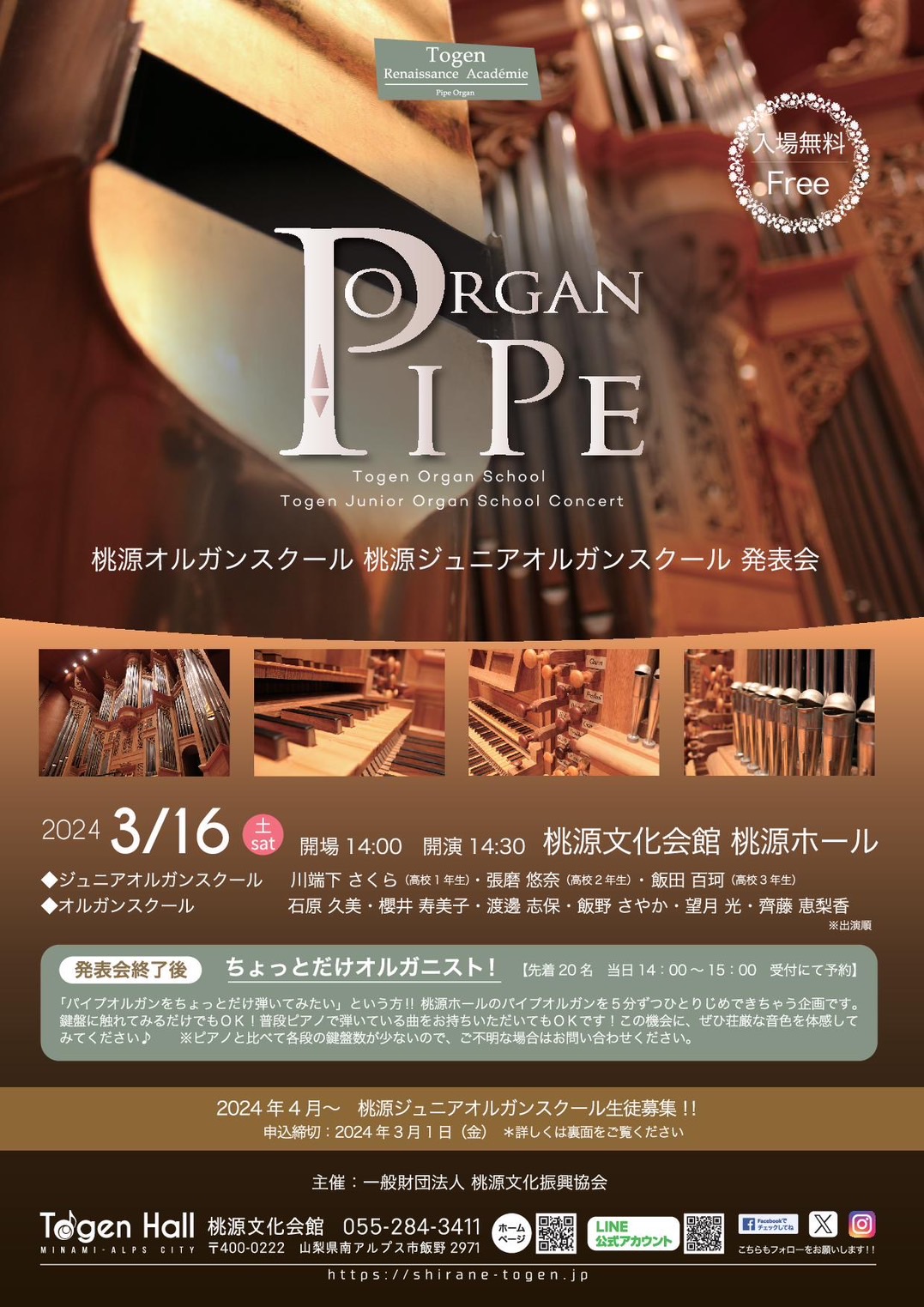 開場時間 : 14:00 開演時間 : 14:30 開催場所 : 桃源文化会館 桃源ホール 入場料 : 無料 ●出演 【ジュニアオルガンスクール】 川端下 さくら(高校1年生)・張磨 悠奈(高校2年生) ・ 飯田 百珂(...