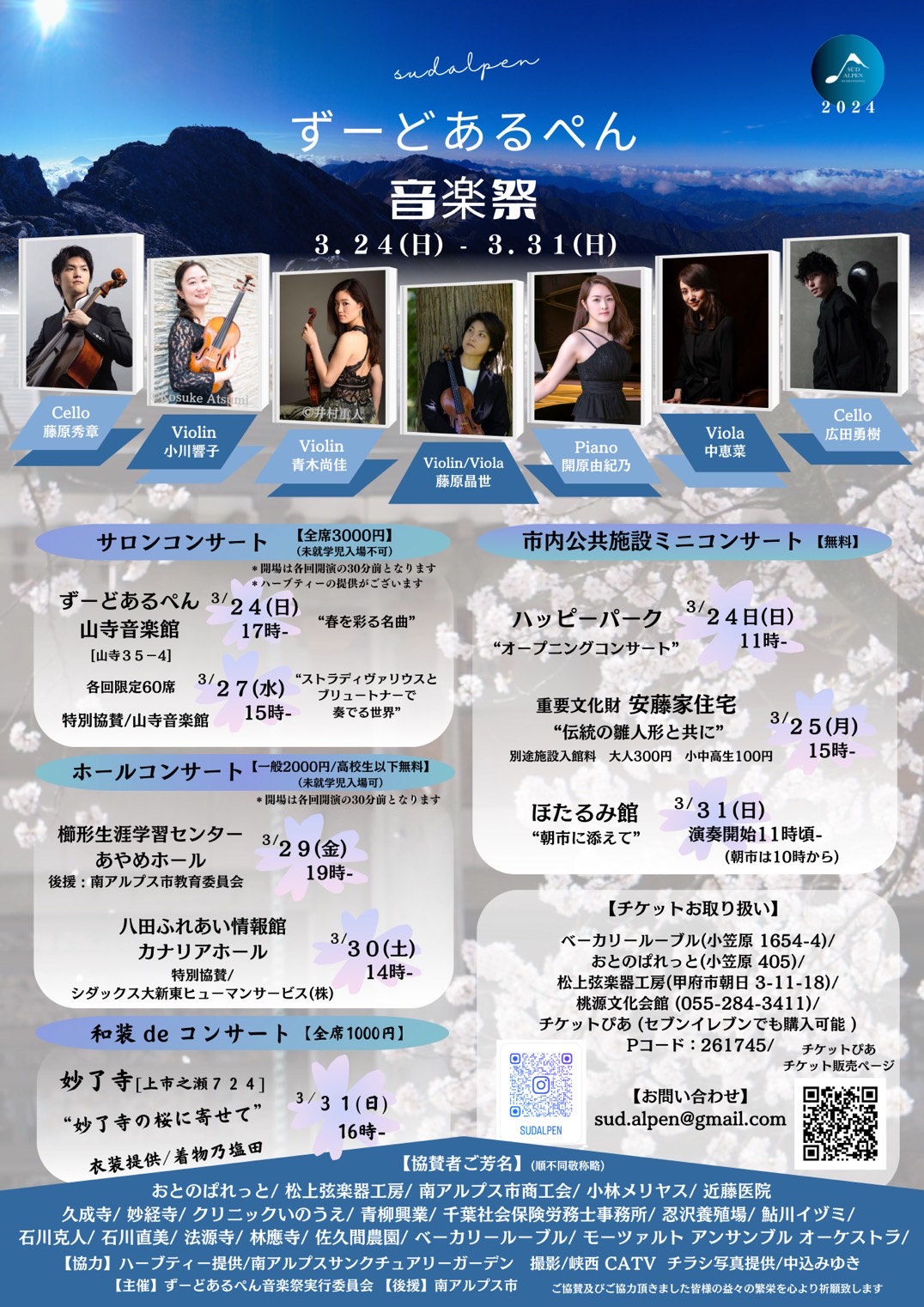 開場時間 : 9時 開演時間 : 11時 開催場所 : 南アルプス市八田総合交流ターミナル ハッピーパーク 入場料 : 無料 藤原晶世 藤原秀章 バッハ無伴奏チェロ組曲より 日本の歌 他 3月24日から31日にかけて南ア...