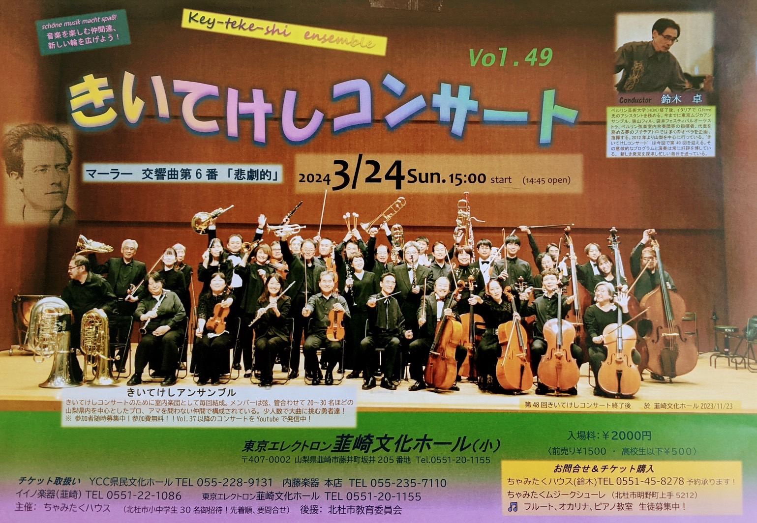 開場時間 : 15:00 開演時間 : 14:45 開催場所 : 韮崎文化小ホール 入場料 : 2000円(前売り1500円、高校生以外500円) 出演:きいてけしアンサンブル 演奏曲目:マーラー交響曲第6番 お問い合わ...