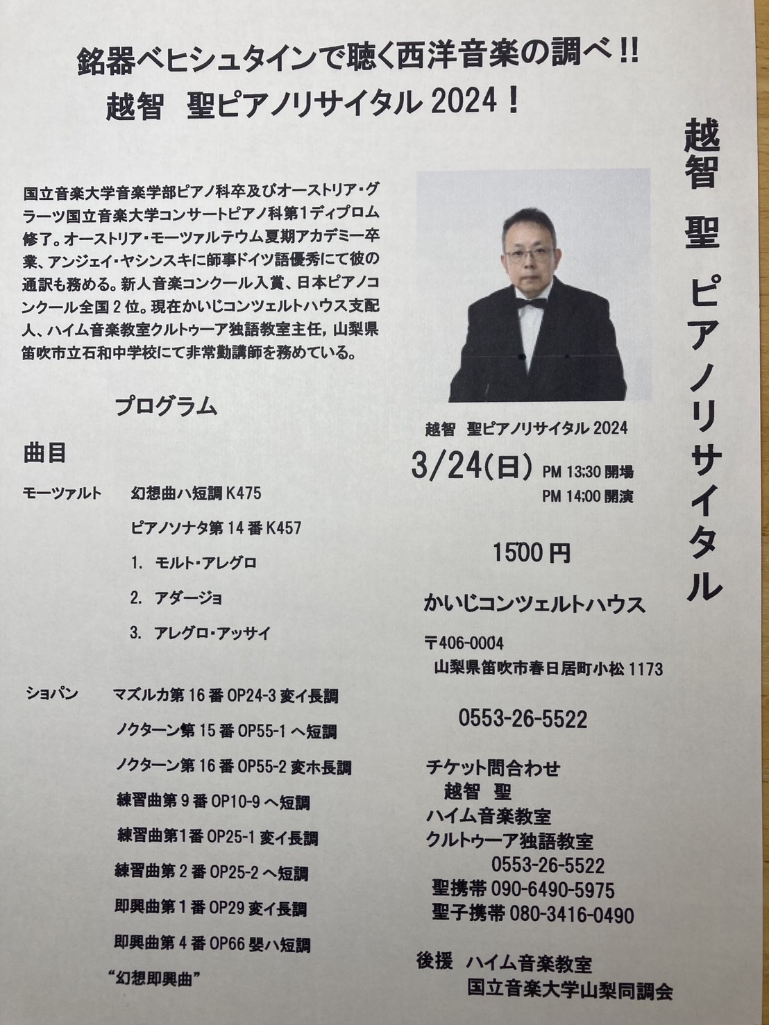 開場時間 : 13:30 開演時間 : 14:00 開催場所 : 笛吹かいじコンツェルトハウス 入場料 : 1500円 モーツァルト 幻想曲K475 モーツァルト ソナタ第14番K457 ⒈モルト・アレグロ ⒉アダージョ...