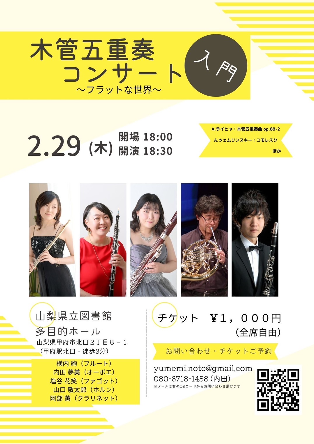 【木管五重奏入門コンサート ~フラットな世界~】 開場時間:18:00 開演時間:18:30 入場料:1000円(全席自由) <出演> 横内絢(フルート) 内田夢美(オーボエ) 阿部薫(クラリネット) 塩谷花...