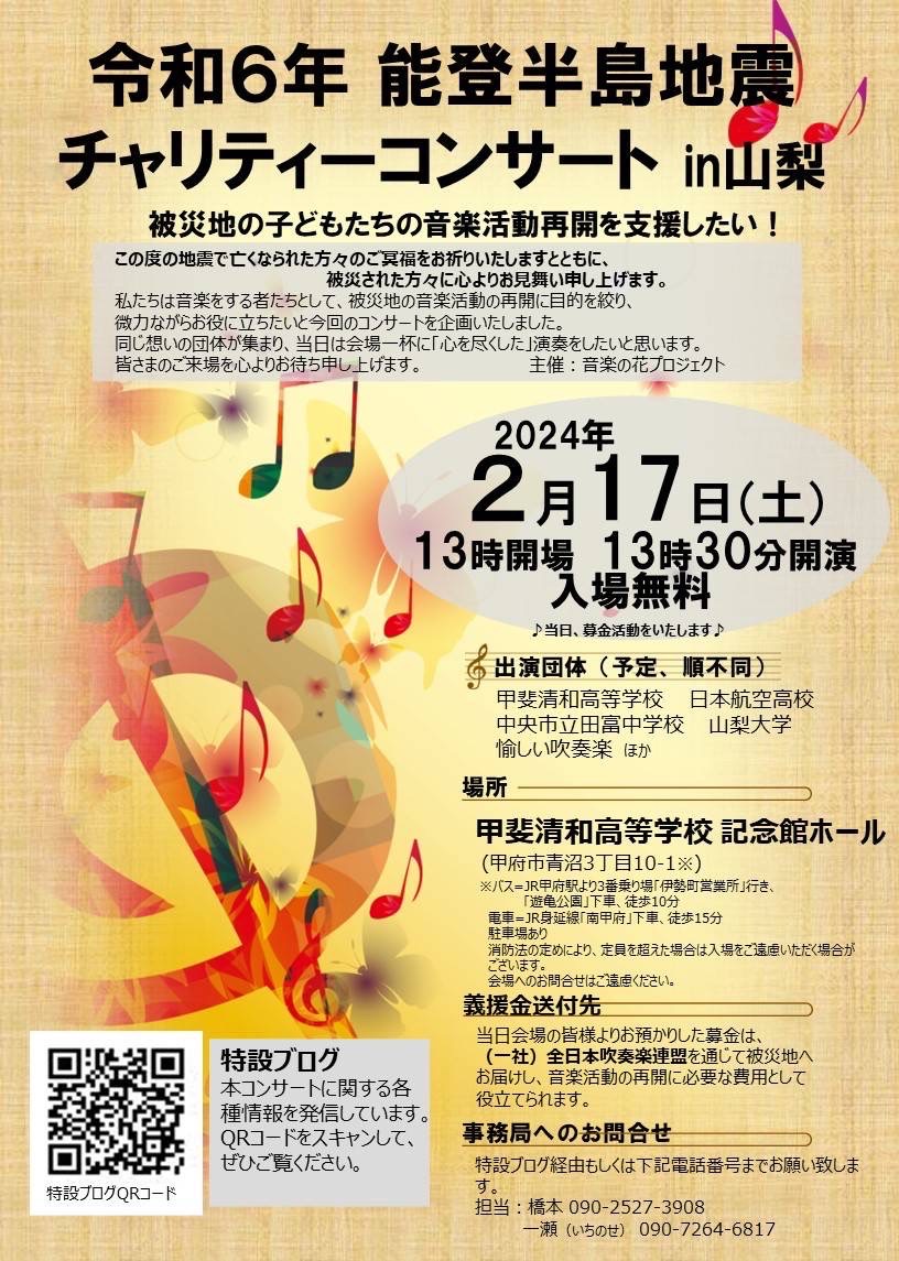 開場時間 : 13:00 開演時間 : 13:30 開催場所 : 甲斐清和高校 記念館ホール 入場料 : 無料 出演者 甲斐清和高校、日本航空高校、田富中学校、山梨大学、愉しい吹奏楽団 ほか 当日募金活動を致します。 募...