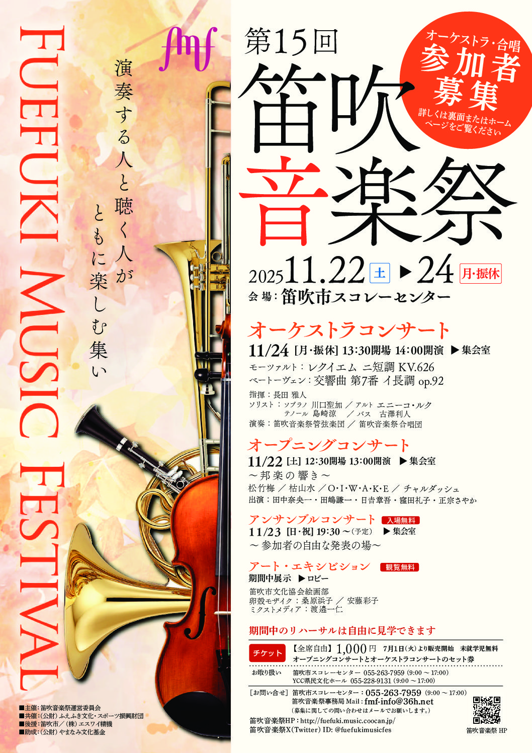 2025年11月22日~24日、山梨県の笛吹市スコレーセンターにて、第15回笛吹音楽祭を開催します。全国から集まったプロとアマチュアの演奏家が オーケストラコンサートで練習の成果を披露します。 また、オーケストラの練習風...