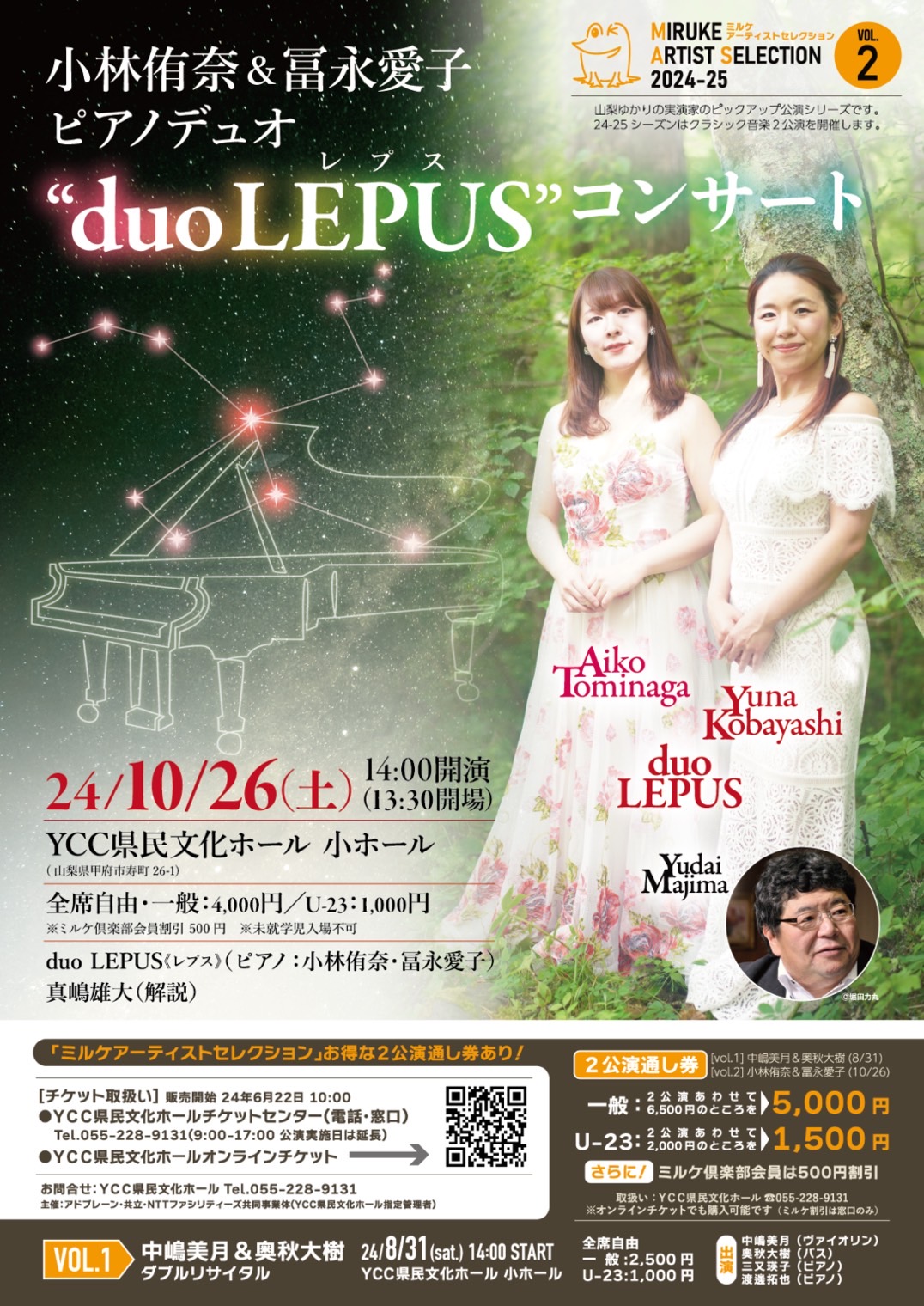 開場時間 : 開場13:30 開演時間 : 開演14:00 開催場所 : YCC県民文化ホール 小ホール 入場料 : 全席自由・一般4,000円・U-23(23歳以下)1,000円 ※ミルケ倶楽部会員割引500円 ※未就...