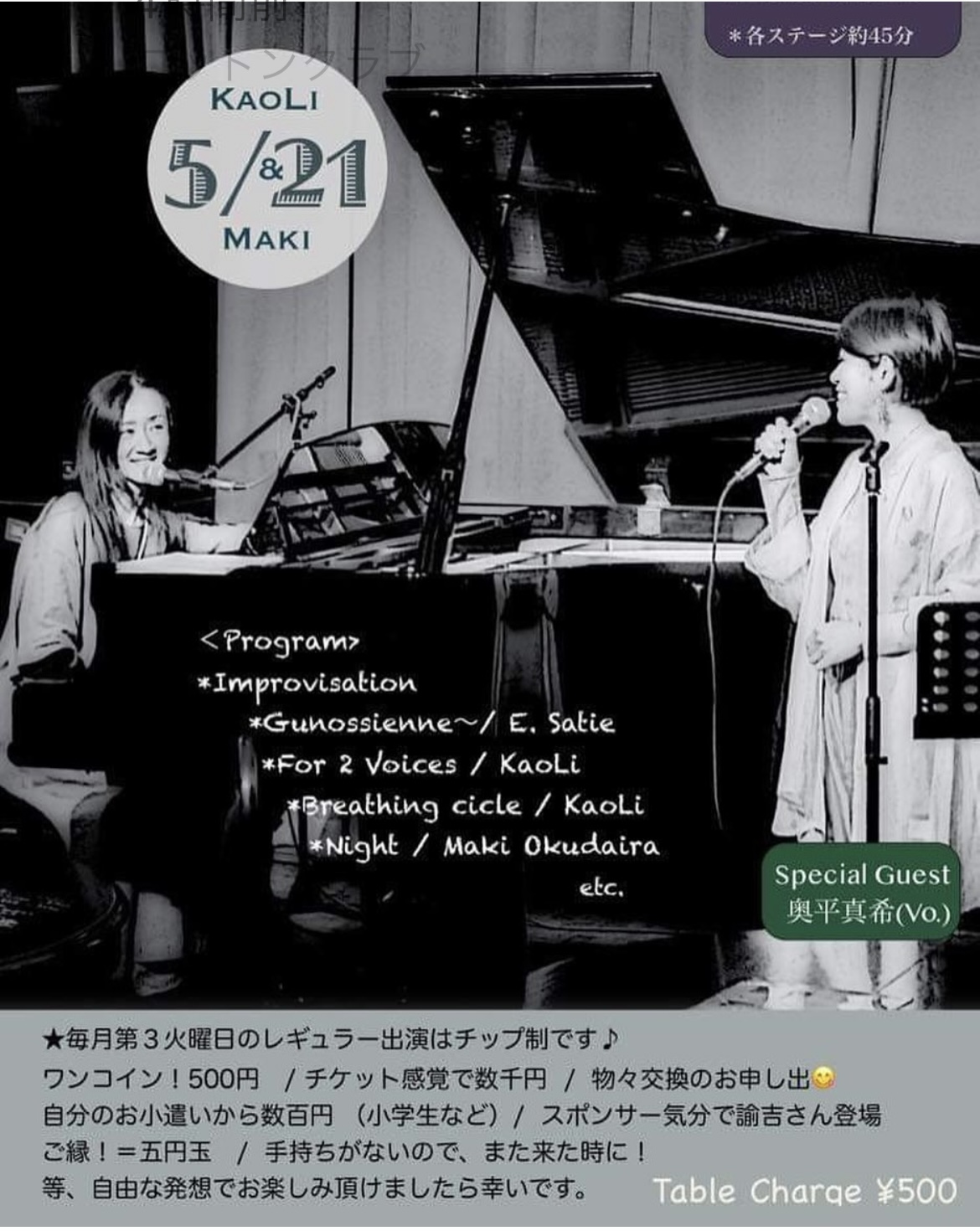 5/21(火) は甲府コットン クラブにて 20:00 ~ /21:00 ~ 2set KaoLiさんと奥平真希のduo! 即興あり、オリジナルあり、ピアノ曲にvoiceで参加したり、色々チャレンジングなライブです♪! ...