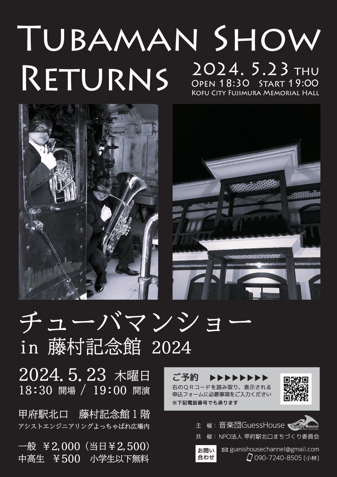 開場時間 : 18:30 開演時間 : 19:00 開催場所 : 甲府市 藤村記念館 入場料 : 一般予約2,000円(当日2,500円)・高校生以下500円・小学生以下無料 チューバマンショーin 藤村記念館 2024...