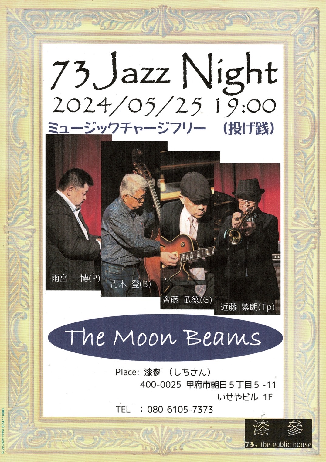 開場時間 : 18:00 Open 開演時間 : 19:00 start 開催場所 : 漆參 73shichisann Public Bar 入場料 : チャージフリー(投げ銭制) 「The Moon Beams」 J...
