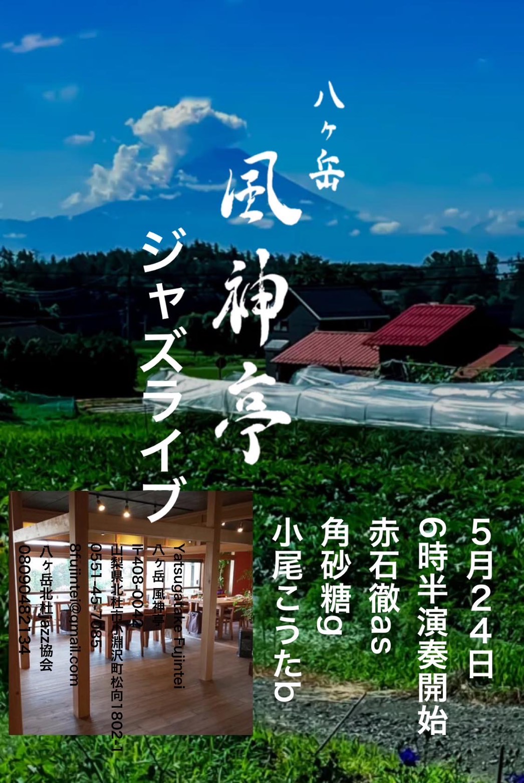 風神亭jazzlive イベント年月日 : 2024-05-24 開場時間 : 17時 開演時間 : 18時 開催場所 : 小渕沢風神亭 入場料 : 無料、飲食代+チップ お問い合わせ先 八ヶ岳北杜jazz協会(小尾) ...