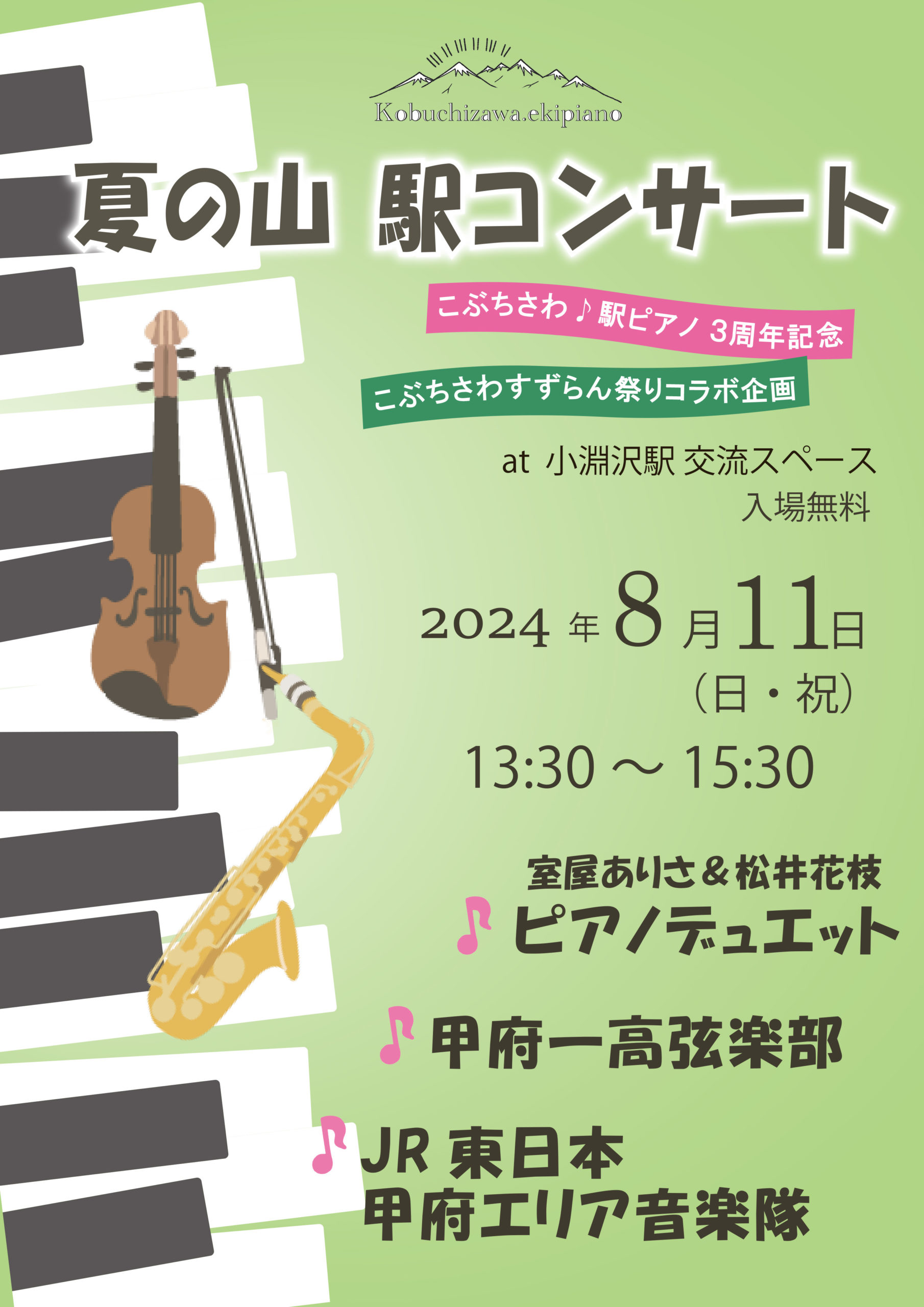 夏の山駅ピアノコンサート 〜こぶちさわ♪駅ピアノ3周年記念〜 日時:2024年8月11日(日) 会場:JR小淵沢駅庁舎内2階交流スペース 出演:ピアノ連弾 県立甲府第一高校弦楽部 JR東日本甲府エリア音楽隊 入場無料 主...