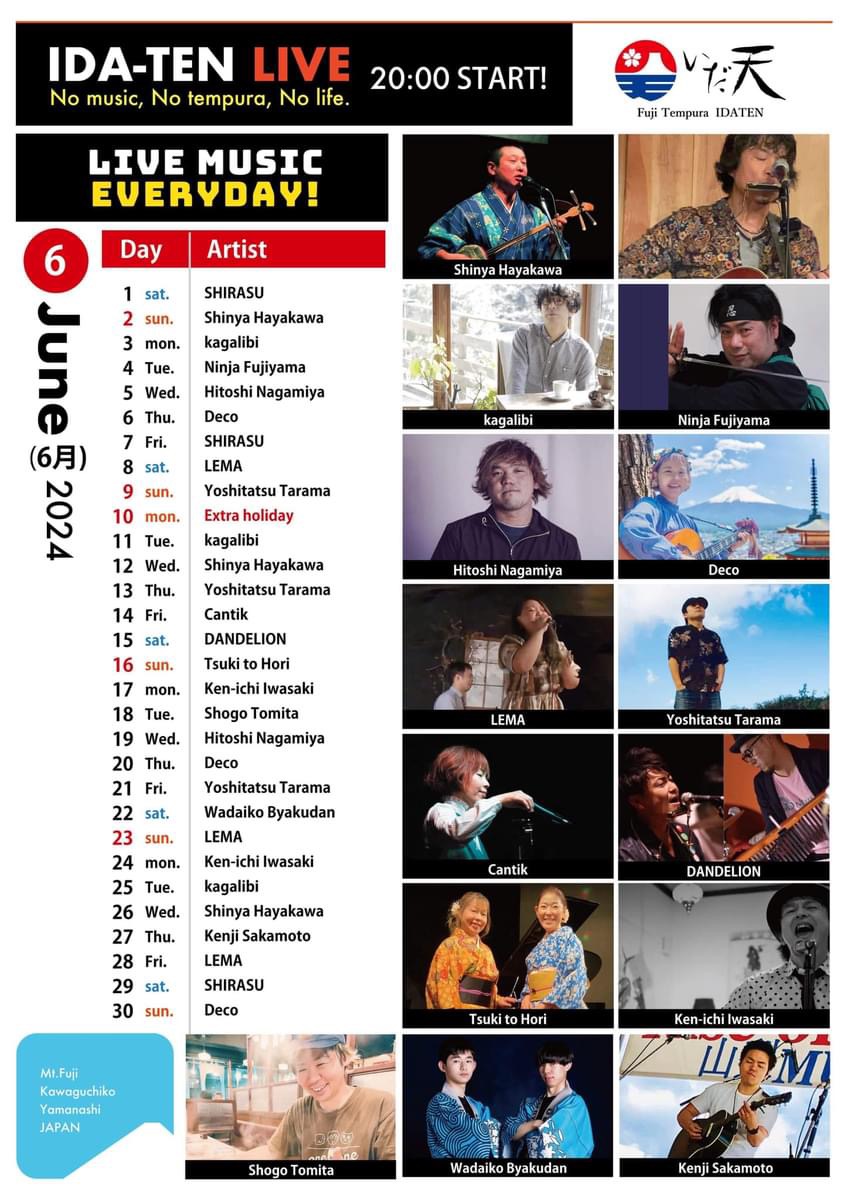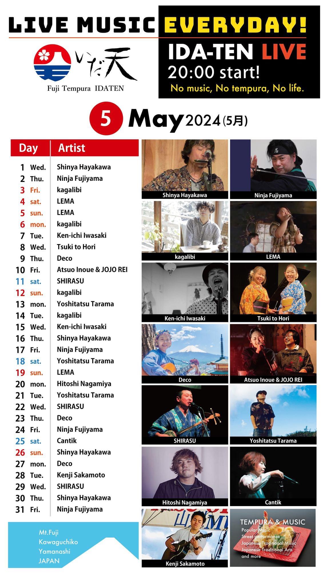 4年ぶりに『いだ天LIVE』が再開します! 5月1日から5月31日まで毎日ライブステージを開催してまいります。 ライブは毎日20:00〜20:50 チャージはかかりません。お店のお食事メニューからご注文をお願いいたします...