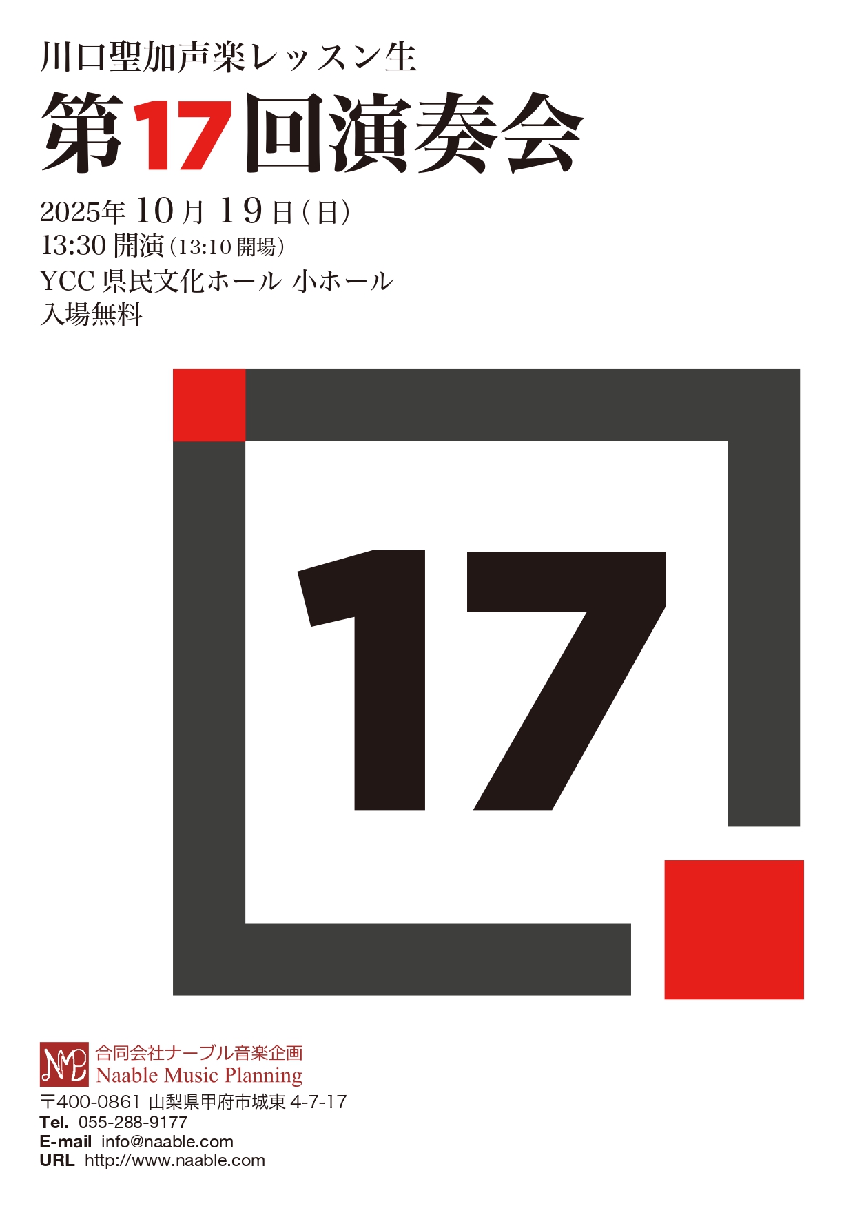 川口聖加 声楽レッスン生 第17回演奏会 2025年10月19日(日) 開場時間 : 13:10 開演時間 : 13:30 開催場所 : YCC県民文化ホール 入場料 : 無料 お問い合わせ先: info@naable....