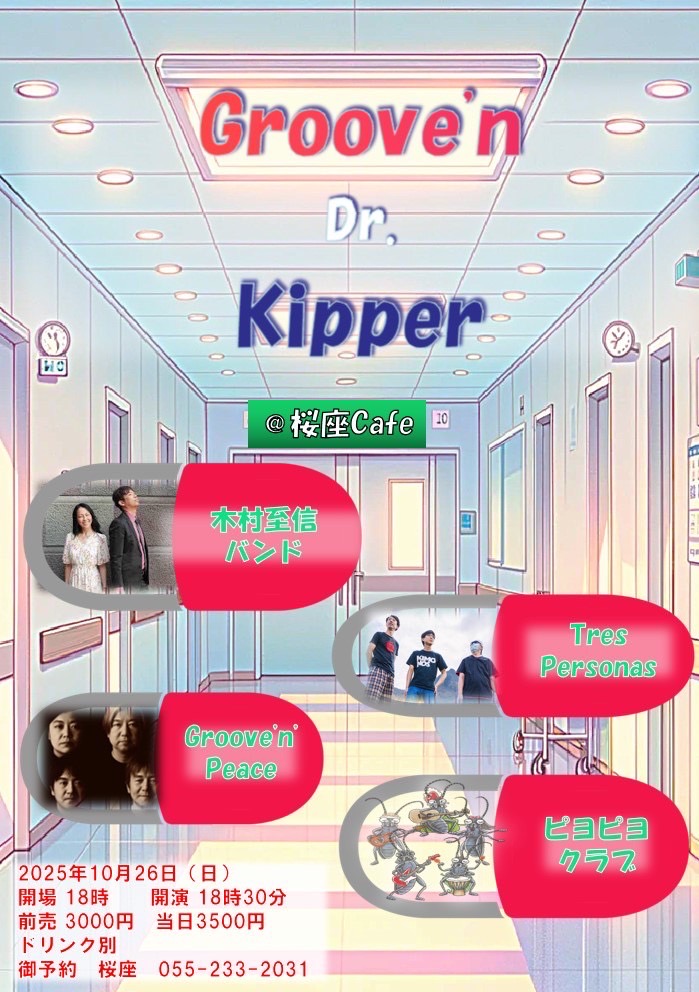 Groove'n Dr.Kipper @桜座カフェ 10月26日(日) 開場18:00 開演18:30 前売3,000円 当日3,500円 別途1Drink600円 Groove'n'peace Tres Persona... |
