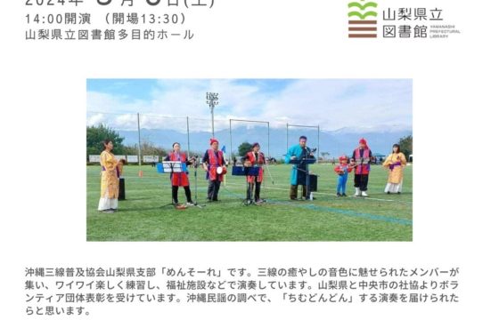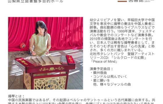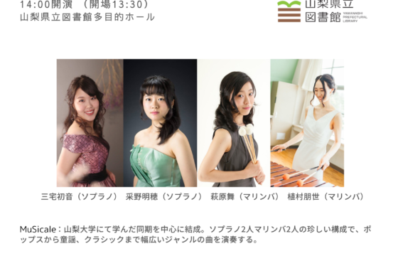 日時:2024年7月14日(日曜日) 14:00開演(13:30開場) 会場:山梨県立図書館2階 多目的ホール 定員:100名(先着順)5月12日(日)14時から予約申込スタート ※聴楽無料 主催:山梨県立図書館 協力:...