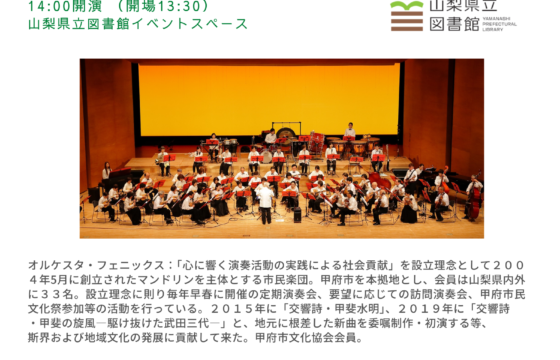 日時:2024年12月15日(日曜日) 14:00開演(13:30開場) 会場:山梨県立図書館イベントスペース オルケスタ・フェニックス:「心に響く演奏活動の実践による社会貢献」を設立理念として2004年5月に創立された...